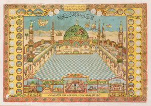 VUE de Médine intitulée " noms des 24 portes du Haram al-sharif" représentant la Rawdha dans un encadrement des noms des 24 portes avec en médaillons les lieux des rites sacrés. Le Caire éditée par al-Maktaba al-tijariya. 66 x 47 cm. sous...