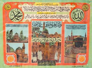 Image de pèlerinage sur fond rouge et vert composé d'un tryptique : la Ka'aba, la Rawdha et la mosquée d'Omar avec, en titre, un verset coranique et un hadith instituant le pèlerinage. Editée par Mohamed al-Joundi, le Caire. 47 x 32 cm....