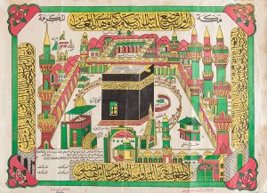 CERTIFICAT DE PELERINAGE représentant la Mecque avec la Ka'aba au centre et l'enceinte sacrée tout autour en vert, jaune et rouge sur fond blanc et dans un encadre ment de quatre cartouches de citations coraniques calligraphiées et quatre roses...
