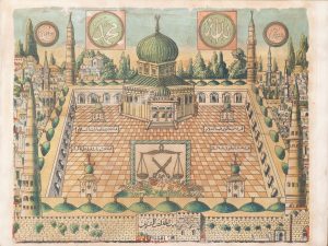 Une image de Beit al-Maqdis (Jérusalem) avec en arrière plan la mosquée d'Omar flanquée des deux noms d'Allah et Muhammed, encadrée par quatre minarets et la cour avec 4 coupoles au nom de Musa (Moïse), Yacoub (le patriarche Jacob), dawud (le...