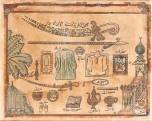 Une image reproduisant les nécessaires du pèlerin figurés avec leurs noms. Au premier plan à droite un minbar et à gauche une tente. Avec deux bandeaux de citations coraniques. Signée en lettres romaines E B. vers 1900. (39 x 31 cm)....