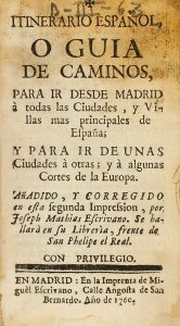 1760. (GUIA). ITINERARIO ESPAÑOL O GUIA DE CAMINOS PARA IR DESDE MADRID A TODAS LAS CIUDADES, Y VILLAS MAS PRINCIPALES DE ESPAÑA ... En Madrid: Miguel Escrivano, 1760. 8º menor. 116 p., 15 h. Pergamino de época.