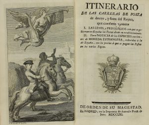 Perez, 1761. 8º menor. 76 p. Frontis y escudo en portada. Texto fileteado. Mapa plegado. [Sigue:] NOTICIA DE LAS MONEDAS ESTRANGERAS Y DE LOS PRECIOS A QUE SE PAGAN LAS POSTAS DENTRO Y FUERA DE ESPAÑA.