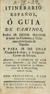 1775. (ITINERARIOS). ITINERARIO ESPAÑOL O GUIA DE CAMINOS, PARA IR DESDE MADRID A TODAS LAS CIUDADES Y VILLAS MAS PRINCIPALES DE ESPAÑA. En Madrid: En la Imprenta de Miguel Escribano, 1775. 8º menor. Enc. pergamino de época.