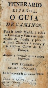 1796. (GUIA-ITINERARIOS). ITINERARIO ESPAÑOL O GUIA DE CAMINOS, PARA IR DESDE MADRID A TODAS LAS CIUDADES Y VILLAS MAS PRINCIPALES DE ESPAÑA, PARA IR DE UNAS CIUDADES A OTRAS, Y A ALGUNAS CORTES DE LA EUROPA. Alcalá: MDCCXCVI (1796). 12º. 184 p....