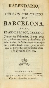 1797. KALENDRIO Y GUIA DE FORASTEROS EN BARCELONA PARA EL AÑO ... Barcelona: en la Imprenta del Diario, 1797. 12º. Enc. en plena piel con ruedas. Texto fileteado. Guardas de seda.