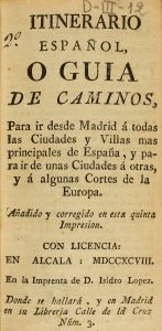 1798. (GUIA-ITINERARIOS). ITINERARIO ESPAÑOL O GUIA DE CAMINOS... En Alcalá: en la imprenta de D. Isidro López, 1798. 12º. [Sigue: ] POCQUELIN: COLECCION DE SAINETES SACADOS DE VARIAS COMEDIAS. Segovia: Imp. de José Espinosa, 1820.