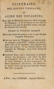 1800 ca. (GUIA). ITINERAIRE DES ROUTES D´ESPAGNE OU GUIDE DES VOYAGEURS POUR ALLER DE MADRID A TOUTES LES VILLES ET BOURGS DE L´ESPAGNE ... Pau: chez Tonnet, sa. 8º. 372 p. Incluye un capítulo dedicado a Routes de Postes. Enc. de época en...