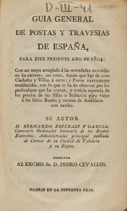 1804. (FITALTELIA-ITINERARIO-POSTAS). GUIA GENERAL DE POSTAS Y TRAVESIAS DE ESPAÑA, para este presente año de 1804. Madrid: Imp. Real, s.a. 8º menor. 4 hojas, 102 p., mapa de España, grabado al cobre y plegado. Pasta española con tejuelo.