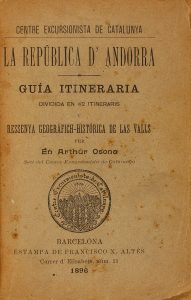 1896. (ANDORRA-ITINERARIOS). OSONA, ARTHUR: LA REPUBLICA D´ANDORRA. GUIA ITINERARIA DIVIDIDA EN 42 ITINERARIS Y RESSENYA GEOGRAFICH-HISTORICA DE LAS VALLS. Barcelona: Estampa de Francisco X. Altés, 1896. 8º menor. 190 p. Plano litográfico...