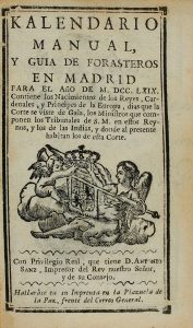 1769. (GUIA-CALENDARIO-MADRID). KALENDARIO MANUAL, Y GUIA DE FORASTEROS EN MADRID PARA EL AÑO 1769. Imp. don Antonio Sanz, 1769. 12º. Grabado en portada. Enc. en plena piel con rueda dorada en el lomo.