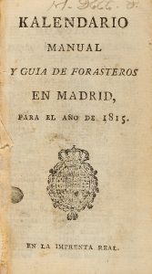 1815. (GUIA). KALENDARIO MANUAL Y GUIA DE FORASTEROS EN MADRID PARA EL AÑO 1815. En Madrid: en la Imprenta Real, 1815. 12º. 176 p. [Sigue:] ESTADO MILITAR DE ESPAÑA AÑO DE 1815. Idem. 270 p. Enc. en plena piel.