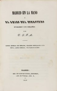 1850. (MADRID-ITINERARIOS-POSTAS). MADRID EN LA MANO O EL AMIGO DEL FORASTERO EN MADRID Y SUS CERCANIAS. Madrid: Imp. Gaspar y Roig, Ed., 1850. 8º menor. 484 p. 13 láminas litográficas y un plano plegado. Enc. en pasta española y tejuelo.