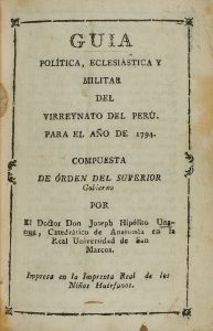 1793 ca. UNGNUE, JOSEPH HIPOLITO:. GUIA, POLITICA ECLESIASTICA Y MILITAR DEL VIRREYNATO DEL PERU PARA EL AÑO 1794. Lima: Imprenta Real de los niños Huérfanos, s.a. 8º menor. XII p. + 1 h. + 306 p. Texto fileteado. 5 estados plegados con tablas. ...