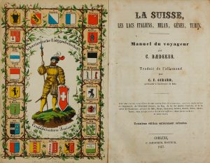 1857. (GUIA SUIZA). BAEDEKER: LA SUISSE, LES LACS ITALIENS, MILAN, GENES, TURIN. Manuel du voyageur par ... Coblenz: C. Baedeker, 1857. 87º menor. Láminas, plano plegado y frontis cromolitográfico. Enc. en tela editorial con plano montado en el...
