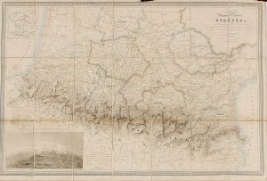 1800 ca. CARTE PHYSIQUE ET ROUTIERE PYRENEES. Paris: A. Vuillemin, sa. Grabado coloreado. 59 x 86 cm. Entelado de época y plegado. Excelente estado de conservación. Presentado en un estuche.