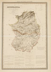 1836. (EXTREMADURA). DUFOUR: ESTREMADURA CON LAS NUEVAS DIVISIONES. Grabado al cobre coloreado. Procedente del Atlas Nacional de España. 84 x 58 cm. plancha; 94 x 68 cm. papel. Montado en cartoné.