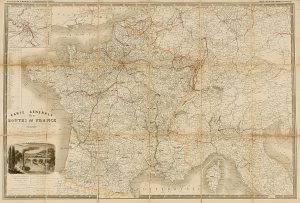 1870 ca. (FILATELIA-FRANCIA). FREMIN: CARTE GENERALE DES ROUTES DE FRANCE ET D´UNE PARTIE DES ETATS LIMITROPHES INDIQUANT ANSI QUE LES CHEMIS DE FER AVEC LES DISTANCES COMPLETEES EN KILOMETRES D´UN LIEU A L´AUTRE POUR LA FRANCE... Paris: Marie et...