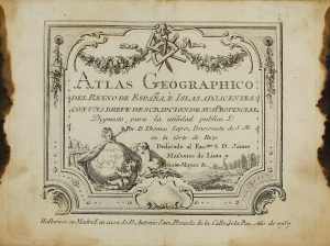 1757. LOPEZ, TOMAS: ATLAS GEOGRAPHICO DEL REYNO DE ESPAÑA, E ISLAS ADYACENTES CON UNA BREVE DESCRIPCION DE SUS PROVINCIAS. Madrid: en la casa de D. Antonio Sanz, 1757. 12º. Portada a doble página con decoración alegórica. 4 páginas de texto....