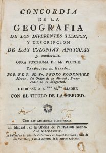1784. (GUIA-MAPAS). PLUCHE: CONCORDIA DE LA GEOGRAFIA DE LOS DIFERENTES TIEMPOS, Y DESCRIPCION DE LAS COLONIAS ANTIGUAS Y MODERNAS. obra póstuma de Mr... traducida al español por el P.M. Fr. Pedro Rodríguez Morzo. Madrid: Ofic. de Pantaleon...