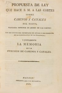 1820. (ITINERARIOS). PROPUESTA DE LEY QUE HACE S.M. A LAS CORTES SOBRE CAMINOS Y CANALES DEL REINO. Madrid: Imp. que fué de Garcia, 1820. 8º. 95 p. Enc. en media piel.