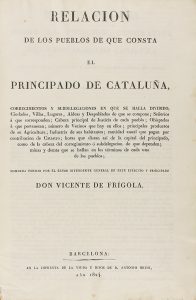 1824. (GEOGRAFIA-POSTAS-CATALUNYA). RELACION DE LOS PUEBLOS DE QUE CONSTA EL PRINCIPADO DE CATALUÑA... Barcelona: Imp. de la Vda. e Hijos de D. Antonio Brusi, 1824. Folio menor. 74 p. Ultima hoja con pequeña pérdida en la esquina. Enc. en plena...