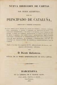 1833. (FILATELIA-CATALUÑA). BALLESTEROS, VICENTE: NUEVA DIRECCIÓN DE CARTAS, POR ORDEN ALFABÉTICO, PARA EL PRINCIPADO DE CATALUÑA, ARREGLADO Á ÓRDENES SUPERIORES. En esta obra se da noticia de todos los pueblos, caseríos, monasterios,...