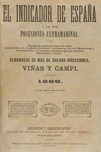 1869. VIÑAS Y CAMPI: EL INDICADOR DE ESPAÑA Y DE SUS POSESIONES ULTRAMARINAS. Barcelona: Palacio de Centellas, 1869. 4º mayor.760 p., Aprox. 150 p. amarillas de publicidades. Enc. en media piel.