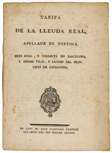 1750 ca. (LOCAL-CATALUNYA). TARIFA DE LA LLEUDA REAL, APELLADA DE TORTOSA. Ques cull, y collecta en Barcelona, y demes villas y llochs del principat de Catalunya. Barcelona: en casa de Joan Francisco Piferrer, sa. 8º. 19 p. [Más:] GUINOVART:...