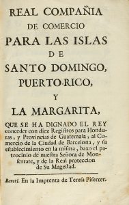 Barcelona, y su establecimiento en la misma, baxo el patrocinio de nuestra Señora de Montserrate, y de la Real proteccion de su Magestad. Barcelona: Imp. Teresa Piferrer., s.a. 8º menor. 151 p. Escudo real en el frontis. Enc. en media piel reciente. Aborda las relaciones comerciales de Cataluña con América en el siglo XVIII, con decretos reales de 4 de mayo de 1755 y 11 de abril de 1756. El proyecto de la compañía fue presentado por Bernardo Gloria y Ramón Picó. CCPB 484250-2. Palau (250975) menciona sólo la edición de Piferrer de 1755, que viene fechada y foliada, pero no ésta.