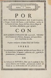 1760. (CORREO EN CUBA). POR DON FERMIN FCO. DE CARVAJAL Y VARGAS, (...) VECINO DE LA CIUDAD DE LIMA, REYNO DE PERU, CORREO MAYOR DE LAS INDIAS, DESCUBIETAS, Y POR DESCUBRIR CON DON JOSEPH CYPRIANO DE LA LUZ, VECINO DE LA CIUDAD DE LA HABANA, (...)...