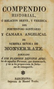 1830 ca. (MONSERRAT). COMPENDIO HISTORIAL, O RELACION BREVE, Y VERIDICA DEL PORTENTOSO SANTUARIO Y CAMARA ANGELICAL DE NUESTRA SEÑORA DE MONSERRATE. Barcelona: Imp. Manuel Texéro, s.a. 8º. Adornado de un frontis y otros 14 grabados en madera (con...