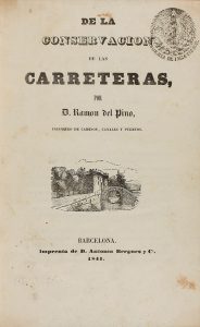 1841. PINO, RAMON DEL: DE LA CONSERVACION DE LAS CARRETERAS. Barcelona: Imprenta de D. Antonio Bergnes, 1841. 8º. 116 p. 3 listados plegados y 1 grabado plegado. Encuadernado en media piel y puntas. Sello estampillado en portada.