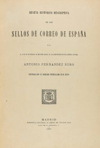 1881. (FILATELIA). FERNANDEZ DURO: RESEÑA HISTORICO-DESCRIPTIVA DE LOS SELLOS DE CORREO DE ESPAÑA. Madrid: Imp. Central, 1881. 4º mayor. 250 p. Enc. en pasta española. Tejuelo y ruedas en el lomo.