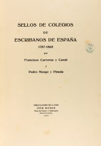 1925. (FILATELIA). MONGE Y PINEDA; CARRERAS Y CANDI: SELLOS DE COLEGIOS DE ESCRIBANOS DE ESPAÑA. 1787 - 1862. Barcelona: Pub. de la casa JodéMonge, 1925. Folio mayor. Folio. 134 p. Numerosas ilustr. en texto. Ed. en papel de hilo. Enc. en plena piel.