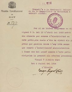 1934. CONJUNTO DE 2 CARTAS MECANOGRAFIADAS CON EL SELLO DE AYUNTAMIENTO REPUBLICANO DE BOT UNA DE ELLAS Y ARBOS LA OTRA.