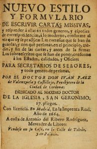 1664. (ESCRITURA). PAEZ, IVAN: NUEVO ESTILO Y FORMULARIO DE ESCRIVIR CARTAS MISSIVAS, ... Madrid: Imp. Real, 1664. 8º menor. 400 p. aprox. Enc. en plena piel. Nervios, tejuelo y lomo cuajado.[Más] NOVISIMO Y COMPLETO ESTILO DE ESCRIBIR CARTAS...