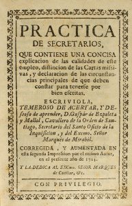 1723. (ESCRITURA). EZPELETA, GASPAR: PRACTICA DE SECRETARIOS, QUE CONTIENE UNA CONCISA EXPLICACION DE LAS CALIDADES DE ESTE EMPLEO, DISTINCIO DE LAS CARTAS MISIVAS... Madrid: Monasterio de San Martin, 1723. 8º menor. 297 p., 3 h. Enc. en pergamino...