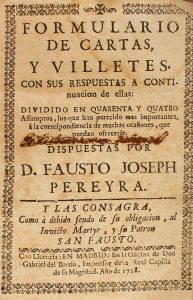 1728. (ESCRITURA-CARTAS). PAREYRA, FAUSTO JOSEPH: FORMULARIO DE CARTAS, Y BILLETES CON SUS RESPUESTAS A CONTINUACION DE ELLAS: DIVIDIDO EN QUARENTA Y QUATRO ASSUMPTOS, los que han parecido más importantes, á la correspondencia de muchas...