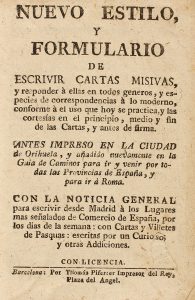 1780 ca. (ESCRITURA). NUEVO ESTILO Y FORMULARIO DE ESCRIVIR CARTAS MISIVAS... Antes impreso en la ciudad de Orihuela, y añadido nuevamente... Barcelona: Thomas Piferrer, sa. [Más:] PAEZ, JUAN: PARA SECRETARIOS DE SEÑORES, Y TODO GENERO DE...