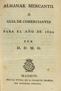 1800. (GUIA). ALMANAK MERCANTIL O GUIA DE COMERCIANTES PARA EL AÑO DE 1800. Madrid: por la Viuda de Don Joachin Ibarra, 1800. 12º. 511 p., LI. Enc. en plena piel.