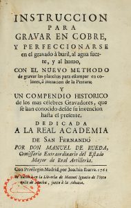 1761. (GRABADO). RUEDA, MANUEL DE: INSTRUCCION PARA GRAVAR EN COBRE Y PERFECCIONARSE EN EL GRABADO A BURIL, AL AGUAFUERTE, AL HUMO. Madrid: Joachin Ibarra, 1761. 8º menor. 230 p. 12 láminas plegadas. [Sigue:] COMPENDIO HISTORICO Y ALPHABETICO DE...