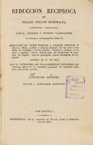 1826. (CAMBIOS DE MONEDAS). REDUCCION RECIPROCA DE REALES VELLON NOMINALES, EFECTIVOS, CATALANES, LIBRAS, SUELDOS Y DINEROS VALENCIANOS, ARAGONESES Y MALLORQUINES ENTRE SI:... Barcelona: en la Imprenta de Manuel Sauri y Co., 1826. 8º. 303 p., 2 h....