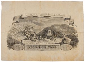 1850 ca. GRABADO DE LA EMPRESA DE LA DILIGENCIA CORREO. Grabado al cobre 12x17 cm. [Más:] SELLO GRABADO DE DIEGO CEPILLO. CORDARIO DIARIO. 4,5x7,2 cm.