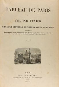 1852. (GRABADOS-PARIS). TEXIER, EDMOND: TABLEAU DE PARIS. Paris: Paulin et Le Chevalier, 1852-1853. 2 vol. en gran folio. I: 4 h. + IV + 388 p.; II: 4h. + 396 p. Texto a tres columnas con abundantes y bellas ilustraciones en el texto. Enc. en media...
