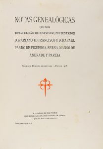 1905. (GENEALOGIA). NOTAS GENEALOGICAS QUE, PARA TOMAR EL HABITO DE SANTIAGO, PRESENTARON D. MARIANO, D. FRANCISCO Y D. RAFAEL PARDO DE FIGUEROA, SERNA, MANSO DE ANDRADE Y PAREJA. Segunda Edición Aumentada, año de 1905. Villanueva y Geltrú: por...