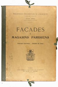 la parte inferior de esta figura el nombre de la imprenta y el año) + 44 láminas (8 a color). Carpeta original impresa, con lomo de tela y cintas para cerrar, ligeramente manchada. Muy buen ejemplar en general. Primera edición de esta hermosa selección de láminas que ilustran diseños de frontales de tiendas Parisinas, todo por arquitectos o diseñadores decorativos (Bagge, M. Dufet, Francisca Jourdain, Ludwig, Pacheco, etc.). La inclusión de láminas coloreadas a mano y de dibujos lineales, lo hace más impresionante que las publicaciones similares del período, algunos frontales de tienda indican la transición de Art Nouveau al estilo de Art Deco que surgió después de la guerra del 1914-18.