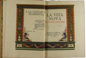 1924. (BIBLIOFILIA). ALIGHIERI, DANTE: LA VITA NOVA. Edición de homenaje preparada y dirigida por A. Saló. Barcelona: s.i., 1924. 4º menor. 108 p., 1 h. Texto a dos tintas y en una bella orla coloreada a mano. Enc. en tela, tejuelo, cortes...