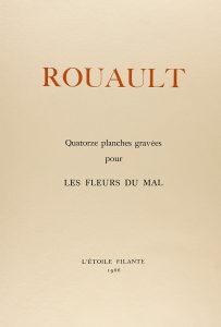 1966. BEAUDELAIRE [texto]; ROUAULT [artista]: LES FLEURS DU MAL. Paris: L´Étoile Filante, 1966. Gran folio (45 X 34 cm.). 14 láminas de grabados de GEORGES ROUAULT. Impreso en grueso papel de hilo con barbas. En rama. Cubiertas y estuche en tela...