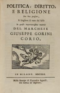 1742. (DERECHO). GORINI, GIUSEPPE: POLITICA, DIRITTO, E RELIGIONE. Milano: Imp. Francesco Agnelli, 1742. 4º menor. 8 h., 363 + 180 p. + XC p., 1 h. Estas últimas 90 p. corresponden a OSSERVAZIONI CRITICHE IN TORNO AL LIBRO POLITICA... DE COSTANZO...